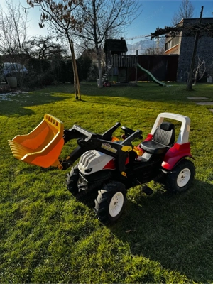 Gut erhaltener Rolly Toys rollyFarmtrac - Steyr 6300 Terrus CVT - Trettraktor mit Luftbereifung, Schaltung, Frontlader und einem Anhänger. Zustand siehe Fotos.