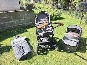 Toller Kinderwagen,in sehr gutem Zustand.NP ca 1000EUR Zubehör: - Hand+Feststellbremse - Regenschutz - Sonnenschirm - großer Einkaufskorb unten - Babytragetasche - Sportwagensitz abnehm- und umdrehbar, somit besteht schon bereits mit der Babytragetasche die Möglichkeit in beide Richtungen zu schieben! - ...