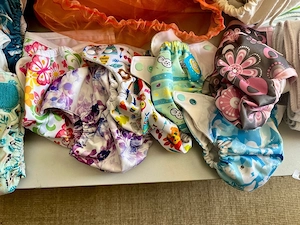 Stoffwindeln, auch AIO, Einlagen (Bambus oder Biobaumwolle), wetbags