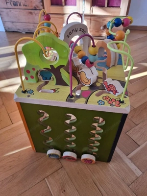 mit 4 verschieden geformte Bausteine zum einwerfen; fördert das Erkennen von Formen und Farben und die Feinmotorik und das Geschick. Als Belohnung spielt Musik.