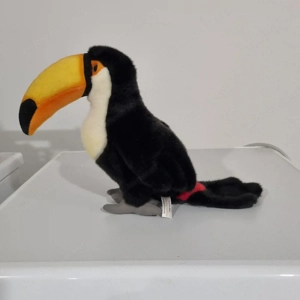 Das Stofftier ist ein Tukan und circa 30 cm groß und 20 cm lang. Am Rücken ist es schwarz und der Bauch ist weiß bis gelblich. Der Schnabel ist gelb bis orange und an der Spitze schwarz. Die Marke ist HermannTeddyCollection. Das Spielzeug ist in guter Verfassung und besteht aus einem sher flauschigem ...