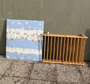 Verkaufen ein Laufgitter mit den Maßen 100x100cm, es ist rollbar (mit Bremse), zusammen klappbar und höhenverstellbar, inkl. Matratze und Auflage Gitterschutz, drei Stäbe lassen sich entnehmen, sodass das Kind auch selbstständig hinein und heraus könnte.