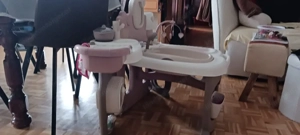 selten gebraucht, gut erhalten, Puppenbett mit Mobile, Badewanne mit Duschkopf, Sitz zum Essen, Bilderrahmen, Zubehörkleinteile, Puppen. Maße zusammen geschoben: B-67cm, T- 64cm, H- 70cm Griff und 2 Räder NP: 120
