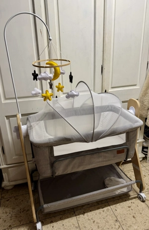 Höhenverstellbar, mit Rollen für Mobilität und einer abnehmbaren Netzseite Inklusive Matratze, Insektenschutz und Mobile mit Sternen Mond-Motiven. Plus 2 Leintücher Ca 75x42