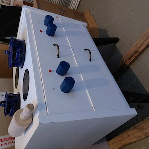Der selbstgebastelte Herd für Kinder hat unseren Enkeln lange viel Spaß und Freude gemacht. Maße: H 50cm, B 50cm, T 33cm