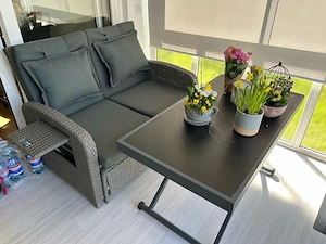 Sehr geehrte Interessentinnen und Interessenten, aufgrund der Anschaffung einer größeren Sitzmöglichkeit, verkaufen wir unsere abgebildete Sitzmöglichkeit, welche noch in sehr gutem Zustand ist. Das Geflecht ist aus Polyrattan und somit äußerst leicht zu reinigen und sehr langlebig. Der Tisch wird ...