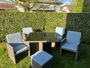 Verkaufe günstig Ratan Garnitur Tisch Grösse 124 cm x 125 cm. 4 Stühle mit Lehne einklappbar. Passen unter den Tisch. 2 Hocker mit original Sitzkissen waschbar.