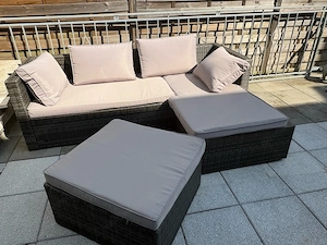 Ratanoptik, mit Tisch Glasplatte und Polster als Hocker
