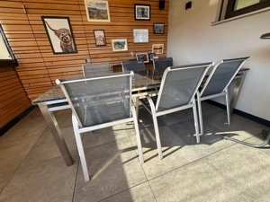 Tisch: Edelstalrahmen mit geschliffener Steinplatte. 240x100 cm (Wetterfest) Stühle: 8 Stk. Aluminium gebraucht, in gutem Zustand.