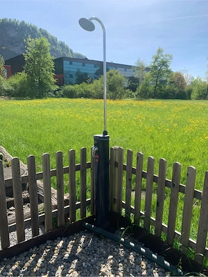 Steinbach Solardusche Flexible Höhe: 217 cm, Schwarz 20 | PVC-Tank Anschlussvorrichtung für Gartenschlauch - Teilbar für platzsparende Einlagerung Selbstentkalkender Duschkopf Integrierter Handtuchhalter & Ablagefläche für Badeutensilien Selbstabholung in Dornbirn