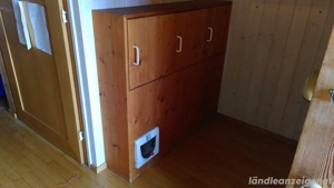 Spezial-Anfertigung. Oberer Teil von der einen Seite zugänglich als 3x2 Fächer mit Türen, unterer Teil von der anderen Seite zugänglich als Schuh-Kommode - inkl. eingebauter Katzen-Klappe Maße in cm: L: 122; T: 26; H: 110,5