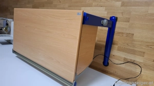 Sehr robuster Schreibtisch, höhenverstellbar. Auch die Arbeitplatte kann verstellt werden. Zwei kleine Mängel, wie auf den Fotos. Der Tisch hat auch eine sehr große Schublade.