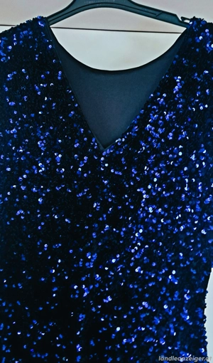 Verkaufe blaues Paillettenabendkleid Gr. 40 42 nur 1 x getragen, Länge des Kleides 118 cm, V-Ausschnitt am Rücken 24 cm lang, Schlitz hinten 36 cm, Rundausschnitt vorne 8 cm und Ärmelausschnitt 25 cm, das ganze Kleid ist gefüttert.
