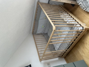 Verkaufen ein Laufgitter mit den Maßen 100x100cm, es ist rollbar (mit Bremse), zusammen klappbar und höhenverstellbar, inkl. Matratze und Auflage Gitterschutz, drei Stäbe lassen sich entnehmen, sodass das Kind auch selbstständig hinein und heraus könnte.