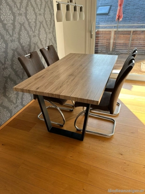 Esstisch mit 4 Stühlen modern & gepflegt Zum Verkauf steht ein schöner Esstisch in moderner Holzoptik mit stabilem schwarzem Metallgestell. Maße des Tisches: Länge: 160 cm Breite: 90 cm Höhe: 75,5 cm Der Tisch weist nur wenige Gebrauchsspuren auf und befindet sich in einem guten Zustand. Dazu gehören ...