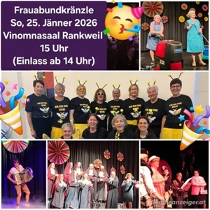 Der Frauenbund Rankweil veranstaltet am Sonntag, 25.01.2026 um 15:00 Uhr im Vinomnasaal Rankweil sein traditionelles Kaffeekränzle mit Spaß, Tanz und cooler Stimmung. Live-Musik: Partyband Jackpot. Da ich an diesem Termin leider verhindert bin, verkaufe ich meine Karte. Anfragen bitte per E-Mail an: ...