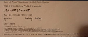 Verkaufe 1 Sitzplatzticket für das Eishockey-WM-Spiel USA - Österreich vom 26.05.26 um 16:20 Uhr. Verkauf zum Originalpreis ! Falls Du das zweite Ticket für das Spiel Ungarn - Lettland (26.05.26; 12:20 Uhr) auch kaufst, erhälst Du beide Tickets zusammen für den Preis von 190 Euro, statt 260 Euro ...