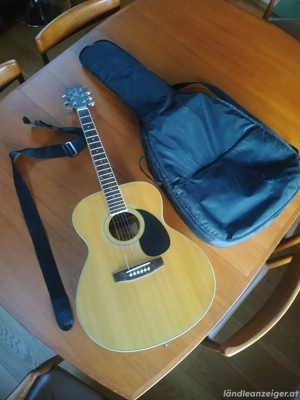 Ca. 30 Jahre alte Gitarre mit Stahlseiten aus Nachlass. Guter Zustand bis auf eine kleine Schramme unten. Mit Tasche und Gurt. Privatverkauf keine Garantie Rücknahme und Gewährleistung möglich.