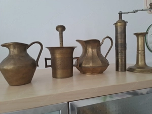 Verkaufe 2Messingkrüge, Kerzenhalter, Mörser und Pfeffermühle. Nur alles zusammen