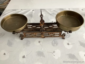 Filigrane antike Küchenwaage mit Messingschalen,aus derzeit um 1920 mit Gebrauchsspuren und Patina- und dem besonderen Shabby-Charme!Auffällig ist der zierliche Pendelstab, der den Ausschlag des Gewichtes anzeigt! Am Gestell ist 3 kg eingeprägt!