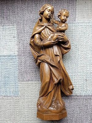 Hier biete ich aus einem Nachlass eine wunderschöne, handgeschnitzte Marienfigur mit Jesuskind an. Wahrscheinlich aus Nuss Holz, 40 cm hoch und ohne Beschädigungen. An der Unterseite ist eine Schraube eingeklebt, da sie auf einem Sockel an einer Wand befestigt war (kann ich aber auch gerne entfernen, ...