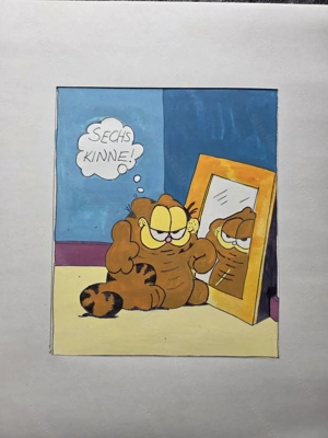 Garfield Bild ist original gemahlt von Jim Davis, seinem Schöpfer und Erfinder selbst. Gemahlte Fläche: 15 x 18 cm