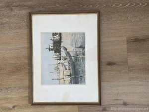 Stimmungsvolles Aquarell mit Schwänen in einer ruhigen Teichlandschaft. Handgearbeitetes Original auf Papier, signiert (Signatur nicht eindeutig lesbar). Gerahmt mit Passepartout, Maße 85 66 cm. Sehr gepflegter Zustand.