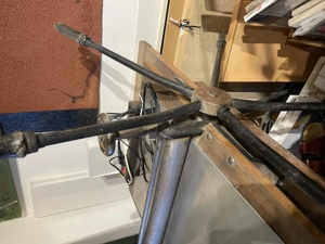Antike Presse für Radierungen bis zu Breite 50 cm. Fix installiert auf einem Vollholztisch mit einer Schublade für Material. Gestell aus Gusseisen. Drehrad ebenfalls aus Gusseisen und Griffe aus Holz. Selbstabholung.