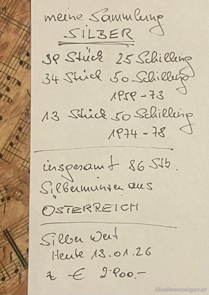 Verkaufe meine Silbermünzen Sammlung. Es sind österreichische 25er und 50er Silbermünzen. Insgesamt 86 Stück Silbermünzen. Weiter Infos bitte den Fotos entnehmen. Űbermittlung der restlichen Fotos bei Kaufinteresse. Privatverkauf - keine Rücknahme oder Gewährleistung