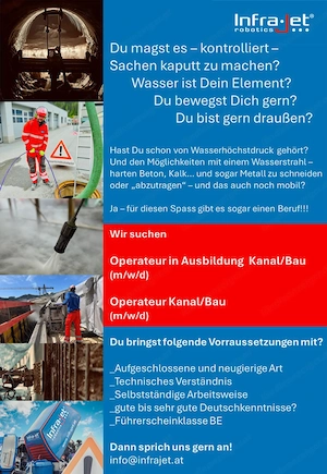 Wir suchen laufend Verstärkung! Du arbeitest gern im Freien, bist technisch interessiert und packst gerne mit an? Dann bist du bei uns genau richtig! Offene Positionen: Operateur Kanal Bau (m w d) Operateur in Ausbildung Kanal Bau (m w d) Das erwartet dich: Arbeiten mit modernster Wasserhöchstdruck-Technik Abwechslungsreiche ...