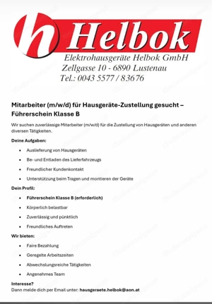 Wir suchen Verstärkung! Du packst gern mit an, bist zuverlässig und hast einen Führerschein Klasse B? Dann komm in unser Team! Die Elektrohausgeräte Helbok GmbH in Lustenau sucht Mitarbeiter:innen (m w d) für die Zustellung von Hausgeräten. Deine Aufgaben: Auslieferung von Hausgeräten Be- und ...
