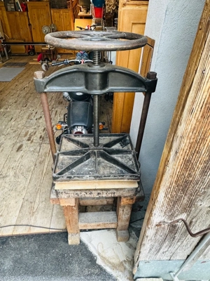 Presse - sehr schönes robustes Teil, Höhe mit Holzfuß 150cm, ohne Holzfuß 85cm, 62cm breit und 40cm tief.
