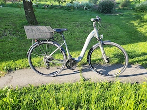 KTM E-Bike, wenig gefahren, rostfrei, sehr guter Zustand, mit folgender Ausstattung: + Mittelmotor + Federgabel + gefederte Sattelstütze + Nabenschaltung mit 7 Gängen + inkl. Korb laut Abbildung + sehr gute Beleuchtung vo+hi + stabiler Seitenständer + gute Reifen + Leichtlaufrad (auch ohne Motorunterstützung) + ...