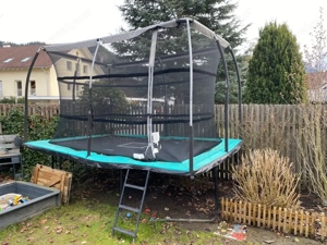 Zum Verkauf steht ein Trampolin mit einem Durchmesser von 427 cm, in einem sehr guten Zustand - der Reissverschluss ist nur Defekt defekt. Das Trampolin ist in einzelnen Teilen abmontiert, sodass man es gut transportieren kann.