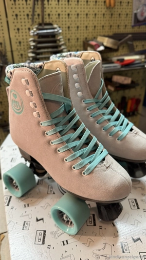 Neuwertig - nur einmal getragen. Stylische Rollschuhe im 70er-Jahre-Disco-Look aus hochwertigem Nubukleder mit Microfaser-Futter. Hoher Schaft für gute Stabilität, bequeme Einlegesohle für hohen Fahrkomfort auch auf längeren Strecken. Ausgestattet mit 61 mm Outdoor-Rollen (78A) für ein geschmeidiges ...