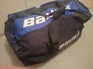 Eishockey-Ausrüstung samt Tasche, gebraucht. Inhalt: Helm (mit Gitter), Schulterschutz, Ellbogenschutz & Schienbeinschoner Hose & Tiefschutz (Cup) Handschuhe, Marke Bauer Schläger, links