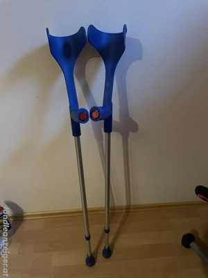Paar Unterarmgehstützen (Krücken) in Blau mit ergonomischen Unterarmauflagen. Die Stützen sind höhenverstellbar, stabil und mit rutschfesten Gummifüßen ausgestattet. Geeignet nach Verletzungen, Operationen oder zur temporären Unterstützung beim Gehen.
