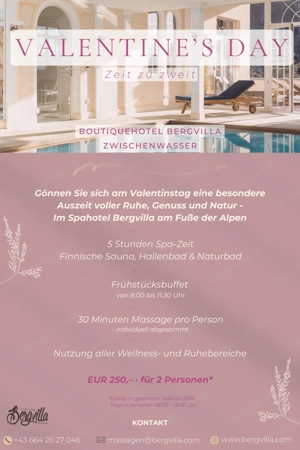 Abseits vom Alltag öffnen wir unser kleines Spa in der Bergvilla in Zwischenwasser auch für Gäste aus der Region - in ruhiger Atmosphäre und mit bewusst begrenzter Verfügbarkeit. Finnische Sauna, beheizter Innenpool, Naturbad und viel Raum zum Abschalten. Auf Wunsch lässt sich der Spa-Besuch mit einer ...