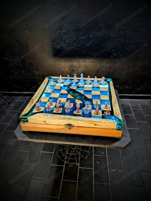 Dieses außergewöhnliche Schachspiel ist mehr als ein Spiel es ist ein Kunstwerk. Jedes Detail wurde mit Hingabe entworfen, gegossen, geschnitzt und montiert: Materialien: Spielfläche: Massives Eichenholz Rahmen: Edles Kirschholz Harz: Kristallklares Epoxidharz im karibischen Türkis Innenleben: ...