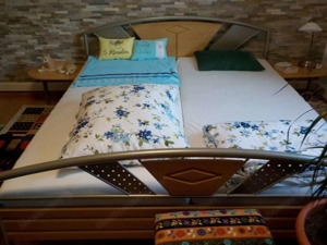 Tolles massives Doppelbett mit 2 Nachtkästchen ohne Matratzen.Holz Buche Natur teilmassive Und ohne anderen Dinge die am Foto abgebildet sind.Mittlere Auflage für die Lattenroste auch vorhanden. nur nicht auf Foto abgebildet . Incl ein Lattenrost 90x200cm Fuß und Kopfteil verstellbar Bett Tadellos ...