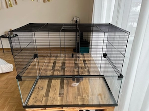 -selbsgebauter Käfig -wir hatten Rennmäuse darin, daher einpaar Gebrauchsspuren (siehe Fotos) -er wurde mit einem Dampfreiniger geputzt (daher die weisse Schlangenlinien) -unterste Etage (Plexiglas) ist für Einstreu, darüber sind 2 Ebenen. ganz oben ist ein Fach für Futter usw... -auf Rollen -Maße 159cm ...