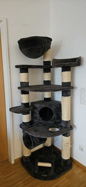 Verkaufe wegen Neuanschaffung großen Kratzbaum in gebrauchtem aber gutem Zustand. Bei einem der untersten Sisalstämme ist das Sisal lose (kann wieder angeklebt werden), einer anderer der untersten Sisalstämme ist das Sisal neu angeklebt worden. Farbe Dunkelgrau, Größe 60 60 180cm. Gekauft bei Dehner, ...