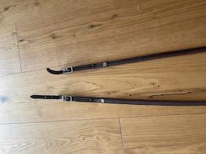 Verkaufe Hillbury Elchleder Zügel in der Farbe Havanna mit integrierten Stegen, Länge 2,90. Neu, waren nur zur Anprobe am Pferd. Neupreis: 129.- würde für 110.- abgeben