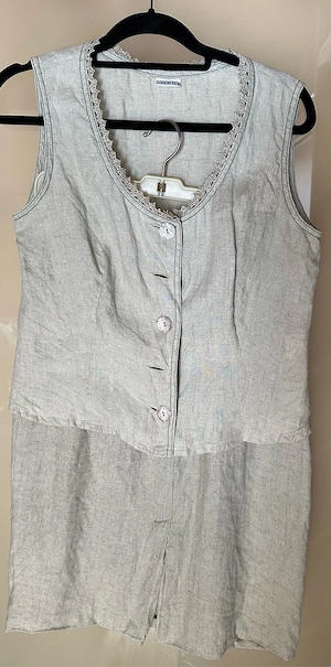 Zweiteiler aus Top und knielangem Rock der Marke "Loden Frey" - Größe 38 - Farbe grau mit grünen Ziernähten - Material: 100 % Leinen - Rock mit 2 Seitentaschen, Reißverschluss und Knopf - ärmelloses Top mit 5 Schildpatt- Knöpfen - gebraucht aber guter Zustand abzuholen im Kleinwalsertal bitte auch ...