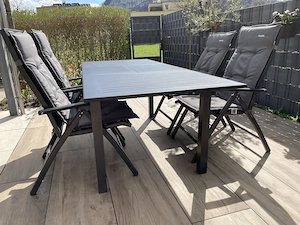 Doppler Expert Gartentisch aus Aluminium. Extrem wetterfest und UV-beständig. Länge: 150 cm (ausziehbar auf 210 cm), Breite: 90 cm, Höhe: 75 cm inkl. 4 Stühlen aus Aluminium mit UV-beständiger und wetterfester Bespannung aus hochwertigem Kunststoffgewebe. 7-fach verstellbar. inkl. Auflagen Neupreis ...